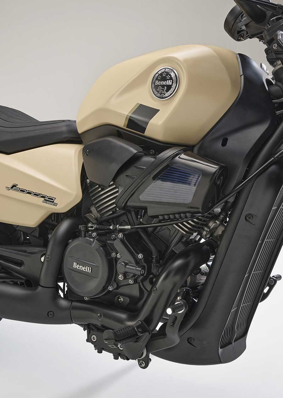 Această unitate propulsoare – primul V-Twin din istoria Benelli – se integrează perfect într-o motocicletă compactă și esențializată, devenind un element central în design. Capacele cilindrilor sunt prevăzute cu aripioare de răcire, care oferă un aer clasic unui motor răcit cu lichid, construit după cele mai moderne tehnologii.